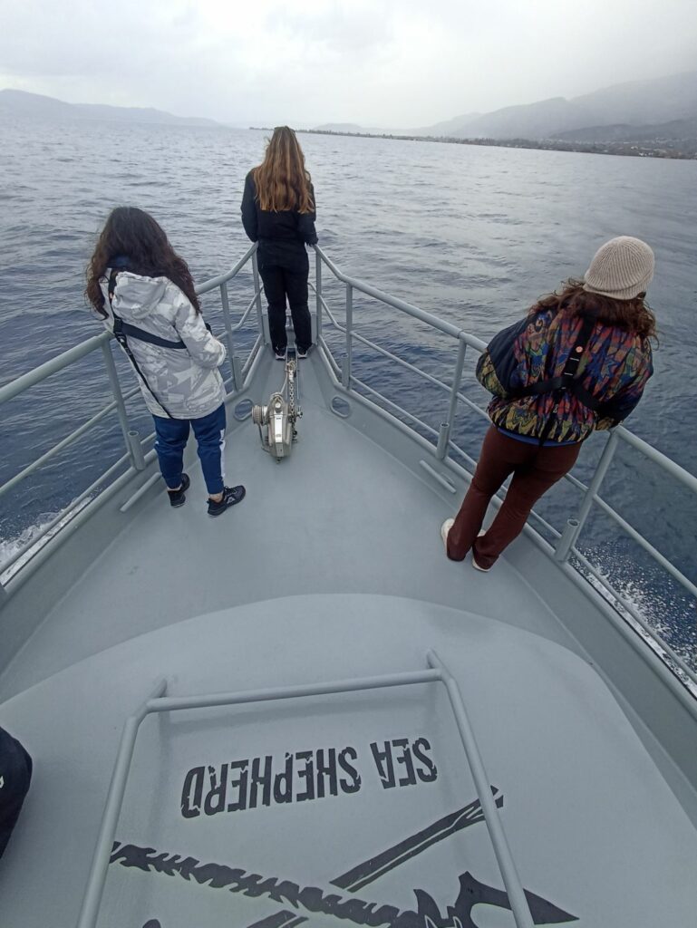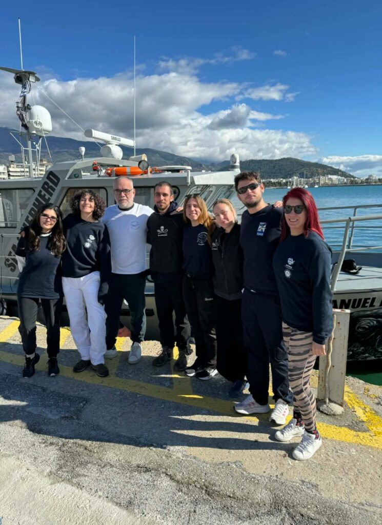 Part of the researchers’ team of the ARION operation, along with the Sea Shepherd Global crew. From the University of Thessaly, Ms. Chrysanthi Rantou, and the Associate Professor and Vice-Chair of the Scientific Committee of the Nationally Coordinated Network for Monitoring and Management of Marine Wildlife, Professor Mr. Georgios Gkafas, from the Veterinary School of Aristotle University of Thessaloniki, veterinarian and PhD candidate Ms. Evridiki Kontemeniotou, from the “Pelagos – Cetacean Research Institute” Mr. Alexandros Tsalapatis, and the leader of the mission, Dr. Elena Akritopoulou, from the University of Thessaly